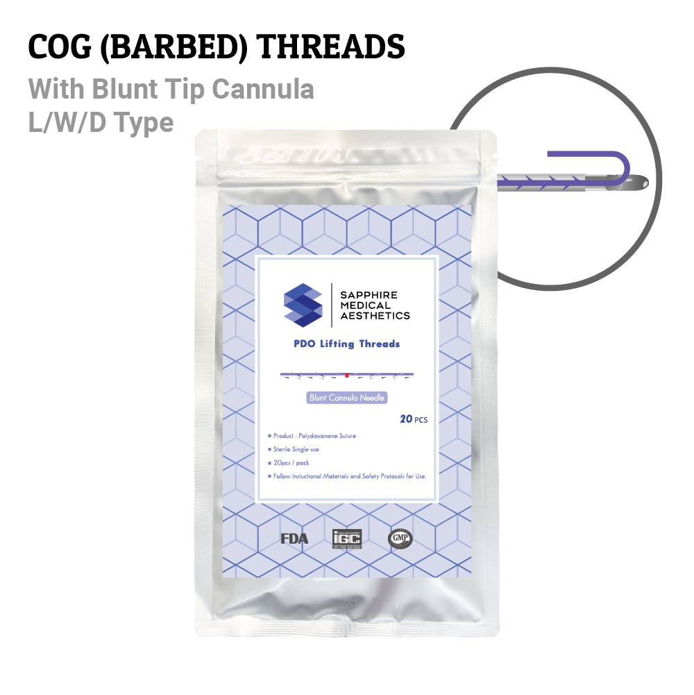 - Cog ‘barbed’ threads contain small barbs that effectively attach to the underside of the skin. They result in a smoother physical lift, allowing the thread to efficiently pull loose, sagging skin.
